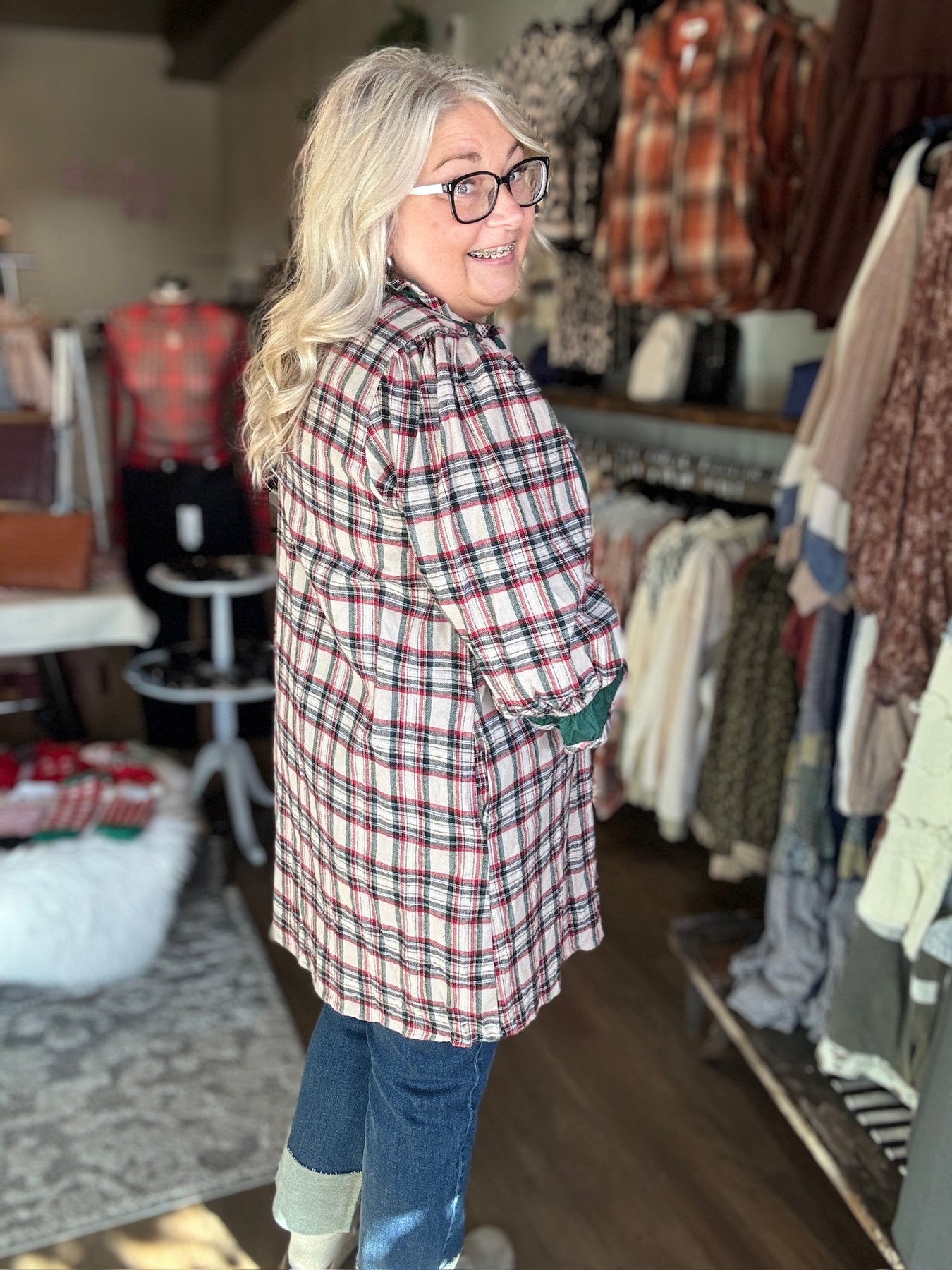 Bring festive cheer to your holiday wardrobe with this playful Plaid Holiday Dress. Featuring a charming plaid pattern and flirty 3/4 sleeves with ruffle details, it’s designed to delight. The V neckline and button-front add a classic touch, while convenient pockets keep your hands cozy. Perfect for Christmas night dinner or festive gatherings, this dress blends comfort with joyful style.