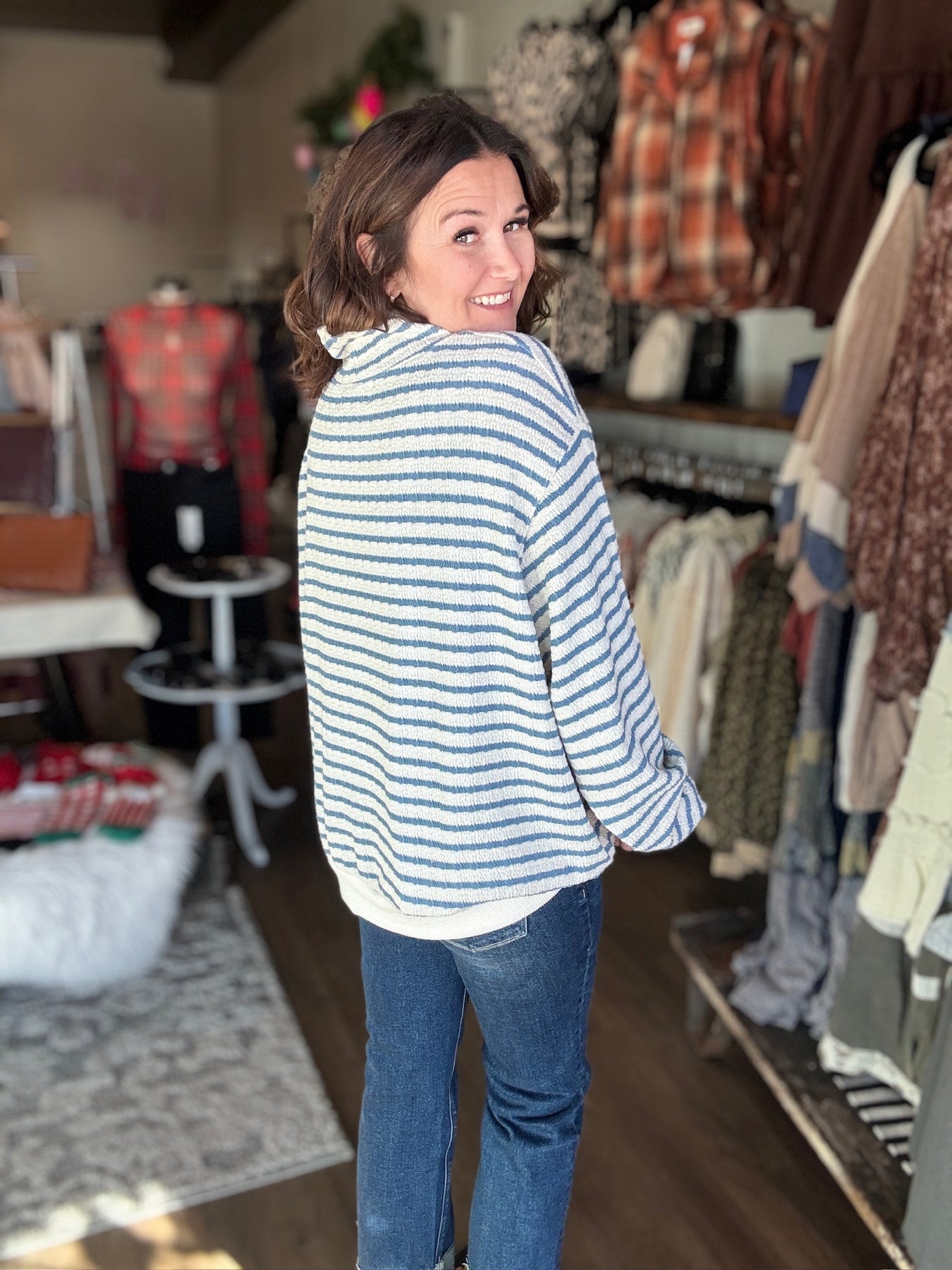 Stay cozy and cute this fall with our Mock Neck Blue Striped Sweatshirt. Made from a textured, soft material, this playful piece hugs you in comfort while the blue and white stripes add a fun twist to your seasonal wardrobe. Perfect for chilly days and snuggly evenings, it’s your new go-to for effortless style and warmth.