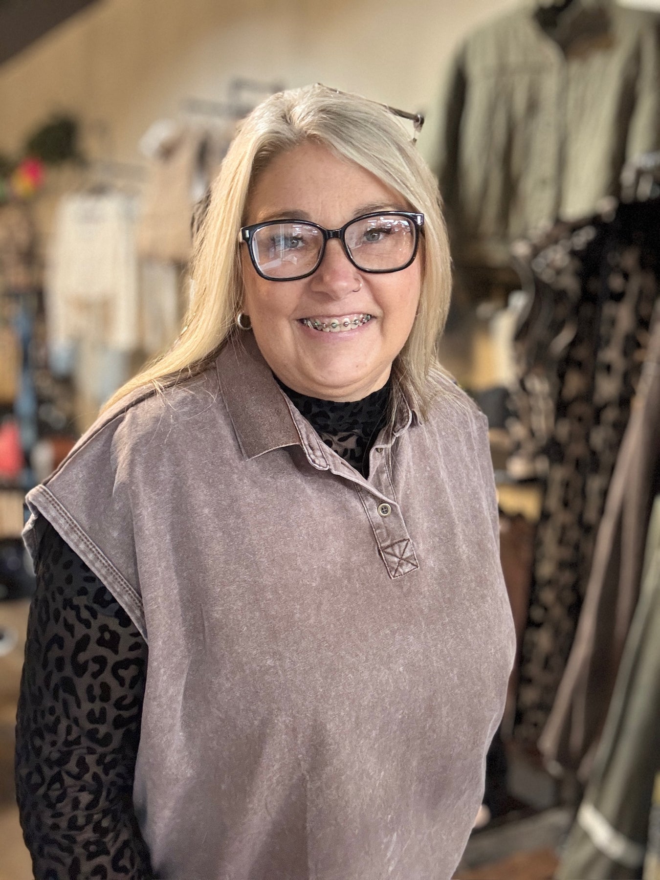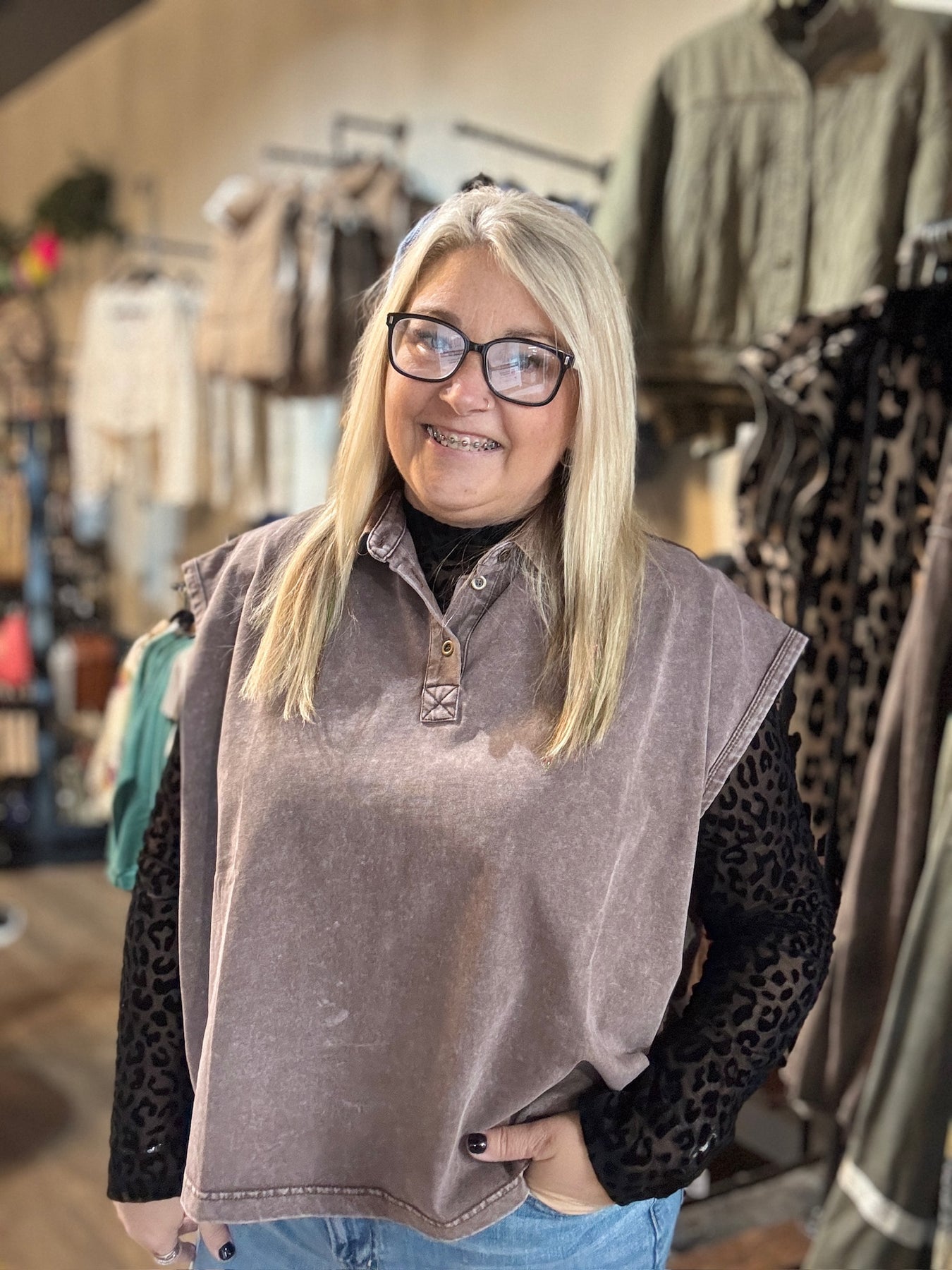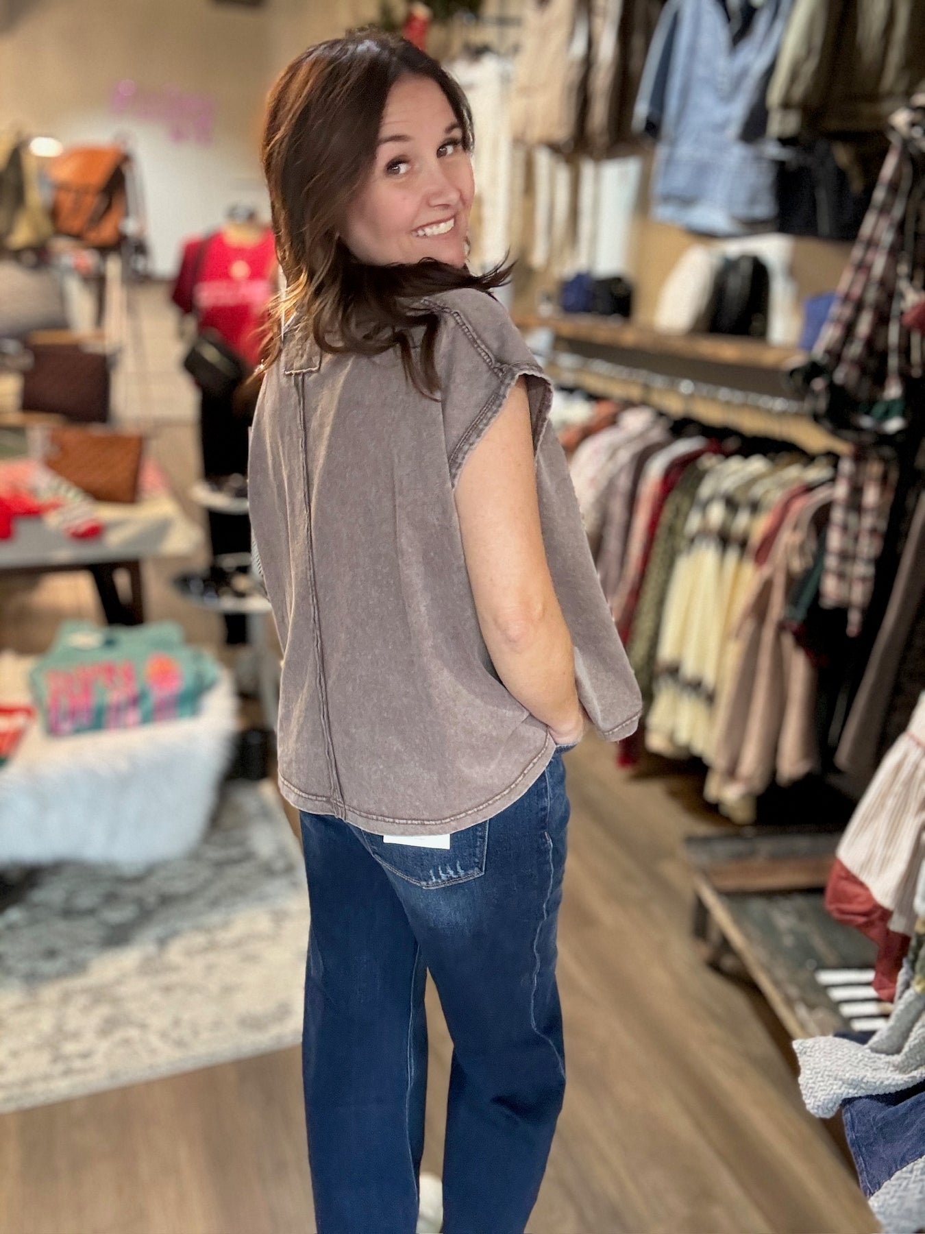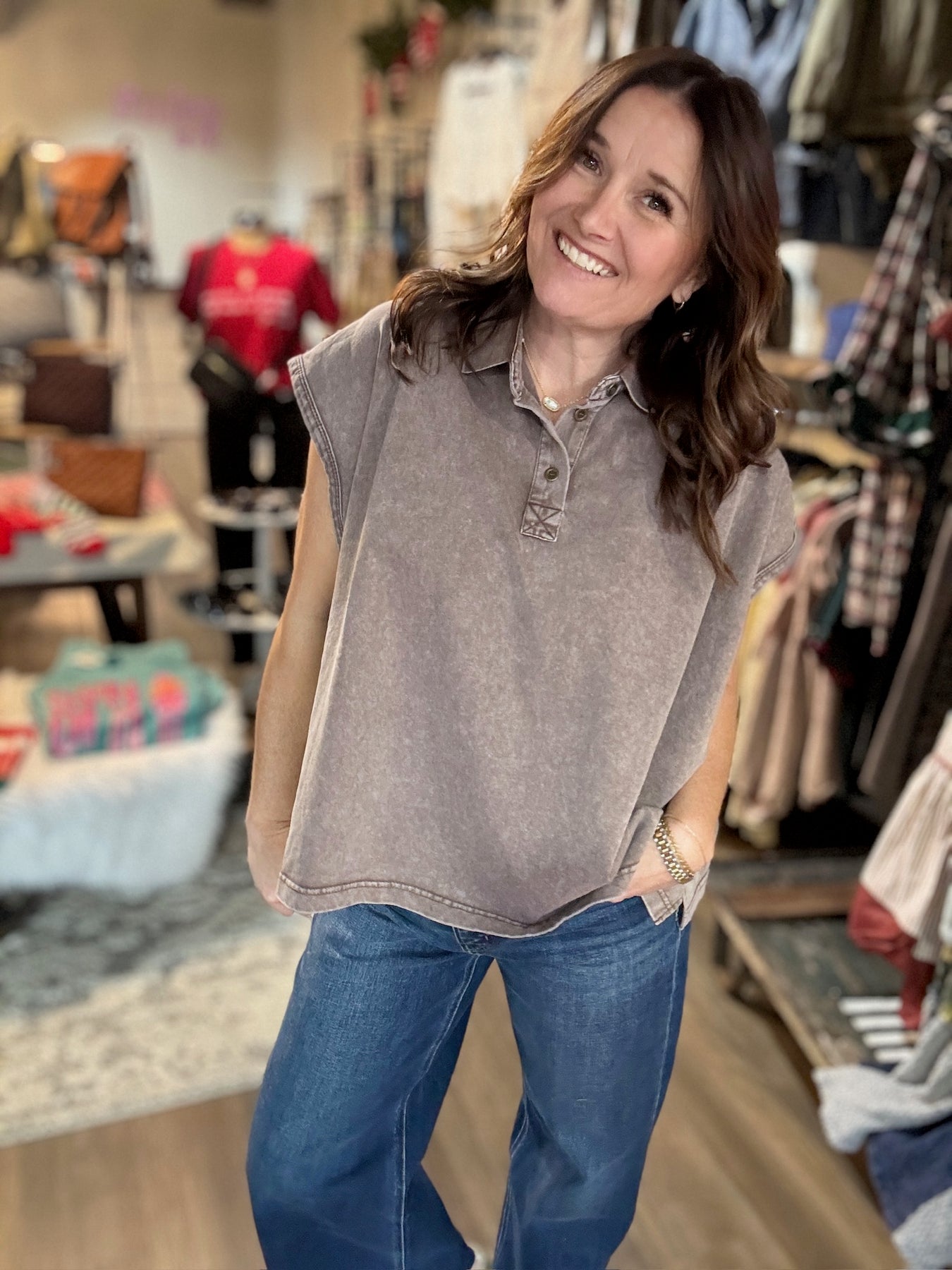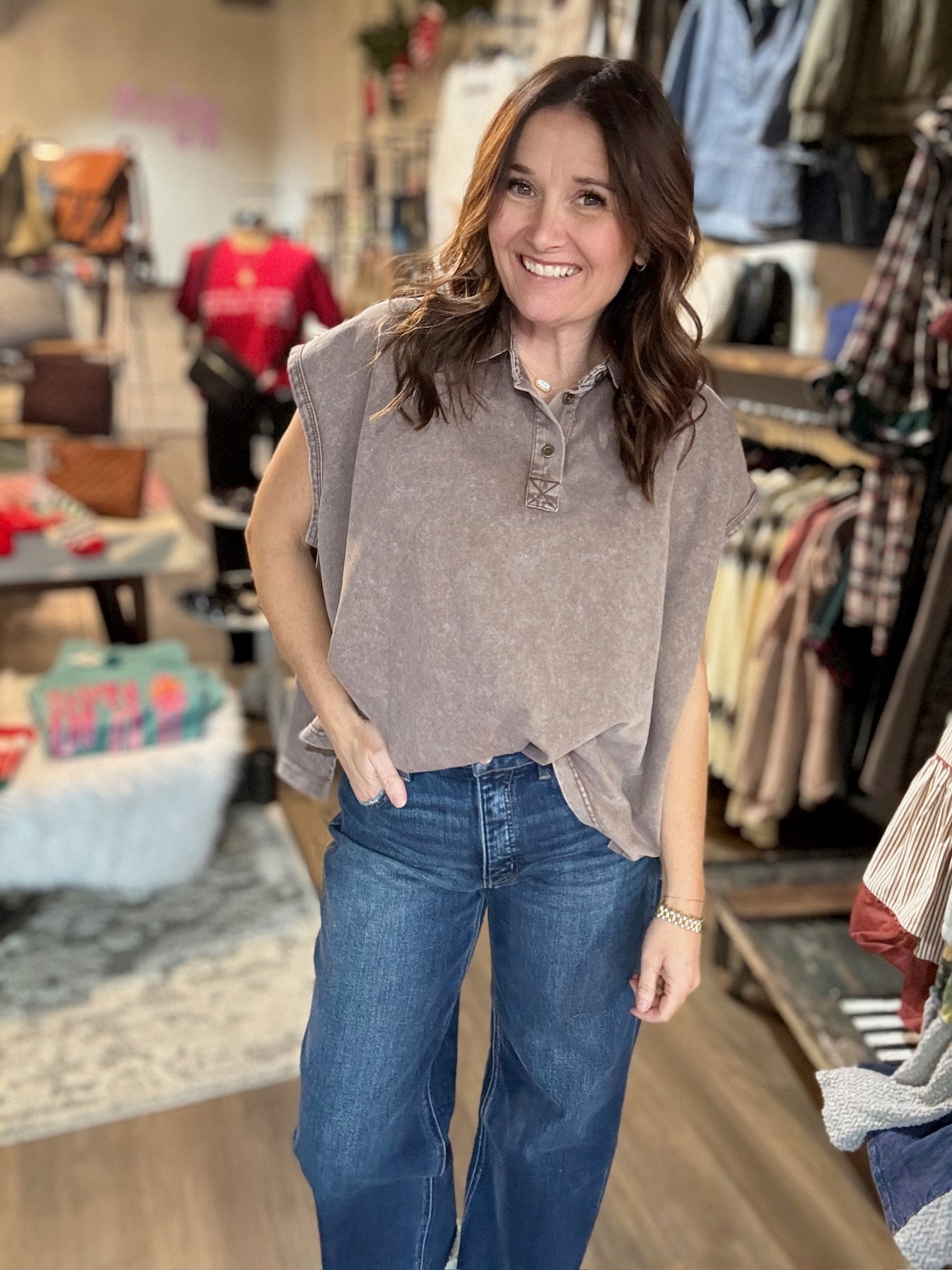 Throw on this laid-back sleeveless tee and instantly level up your casual game. The washed brown hue gives off effortless vintage vibes, while the collared neckline and cute cap sleeves add just enough polish to dress it up or down. Cut in an oversized fit that's perfect for layering or going solo, this wardrobe staple works overtime whether you're running errands or grabbing coffee with friends. Simple, stylish, and oh-so-wearable.