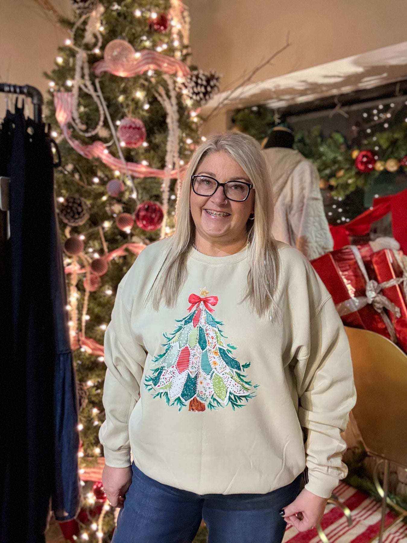 Wrap yourself in holiday cheer with this tan sweatshirt featuring a whimsical patchwork Christmas tree design. Perfect for festive gatherings and cozy winter days, this comfy essential brings playful spirit to your seasonal wardrobe. The unique tree motif adds character and charm, making it an instant conversation starter at holiday parties and family celebrations. Soft, comfortable, and undeniably fun—your new favorite way to celebrate the season.