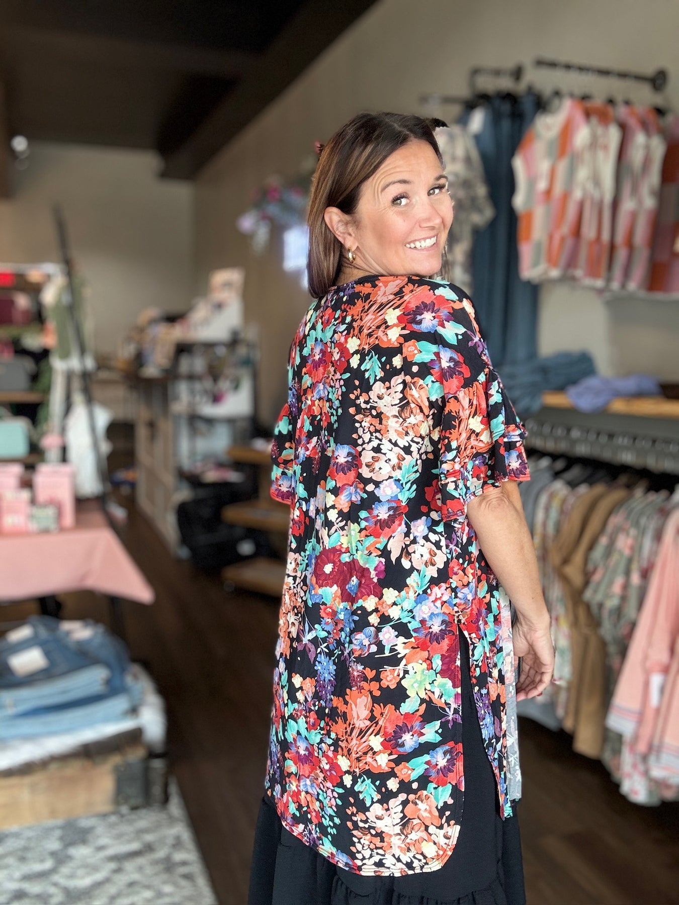 Float into the room with this playful Black Floral Kimono! Featuring a fun and flirty floral pattern and ruffle sleeves, this kimono is made from stretchy soft fabric for all day comfort. Add a touch of quirky style to any outfit with this must-have piece.