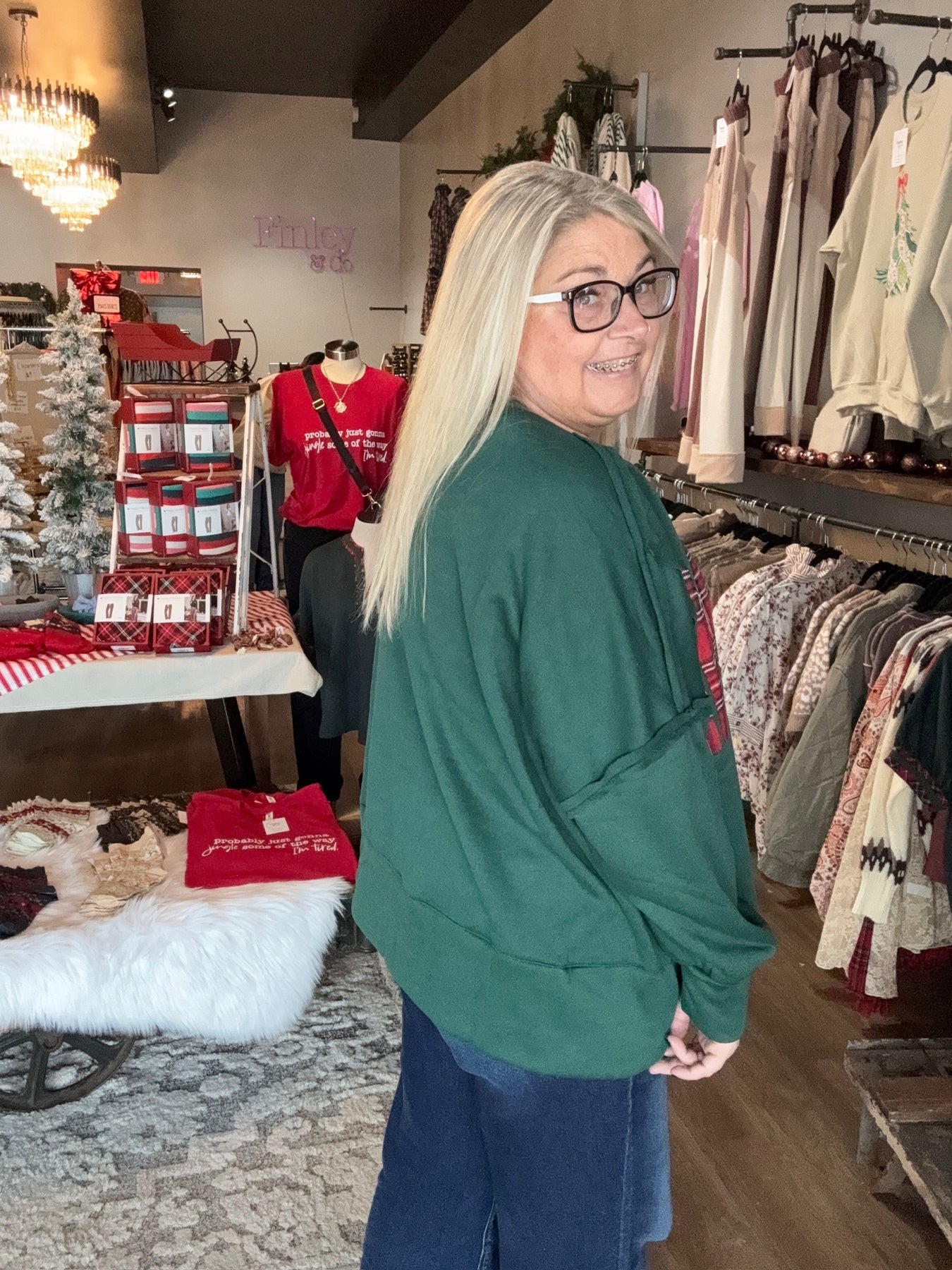 Wrap yourself in holiday cheer with this oversized green crewneck sweatshirt! Featuring playful "merry" plaid lettering across the chest, it's the perfect cozy layer for festive gatherings. Crafted from super soft fleece that feels like a warm hug, this sweatshirt boasts practical front slits for easy movement and effortless style. Whether you're sipping cocoa by the fire or heading out for seasonal adventures, this cheerful piece brings comfort and personality to your winter wardrobe.